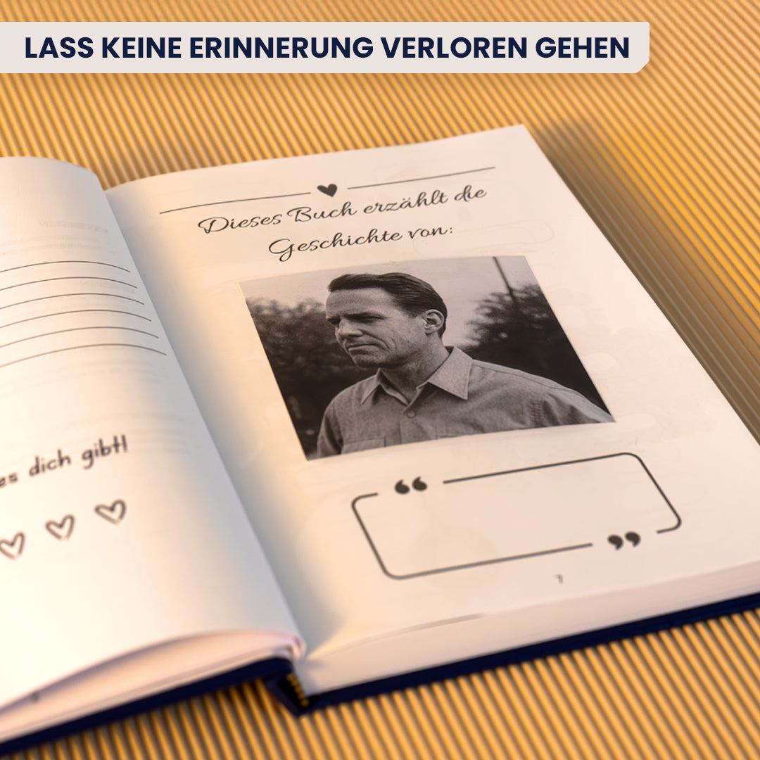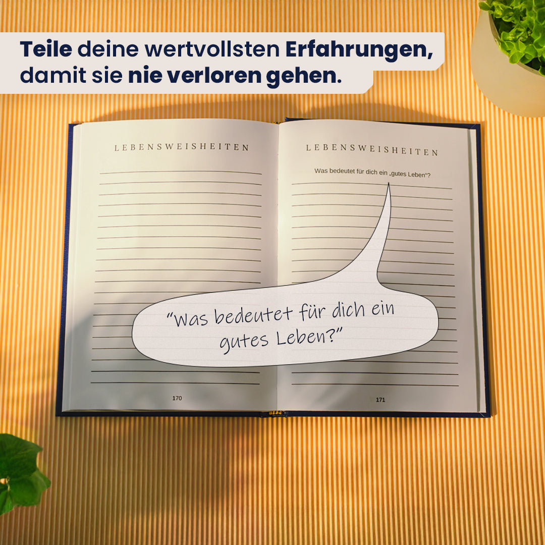 Die sorgfältig ausgewählten und geführten Fragen leiten dich Schritt für Schritt durch die Kapitel, sodass Erinnerungen und Geschichten mühelos festgehalten werden können.